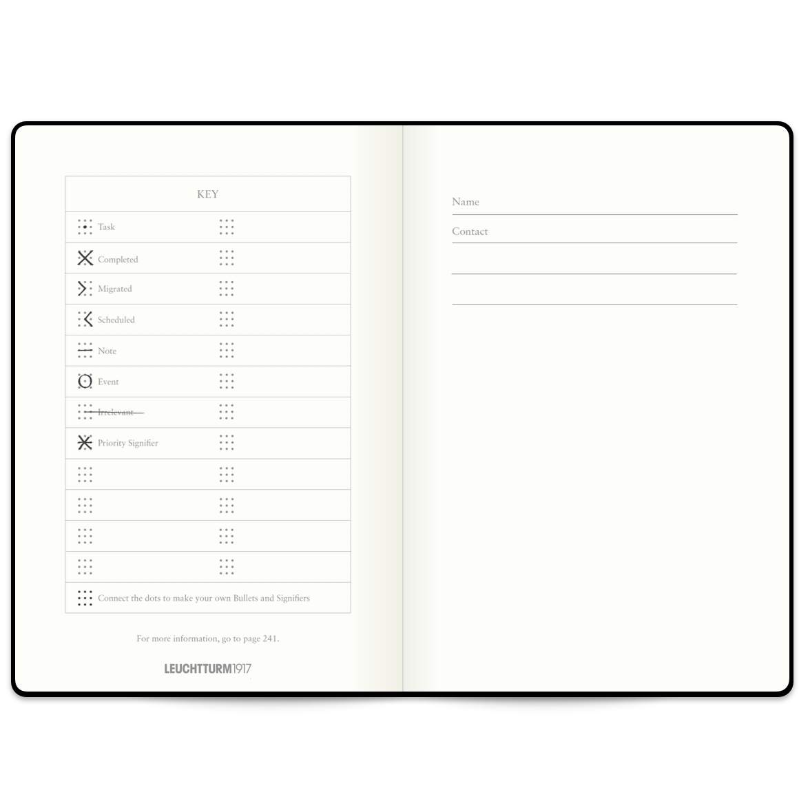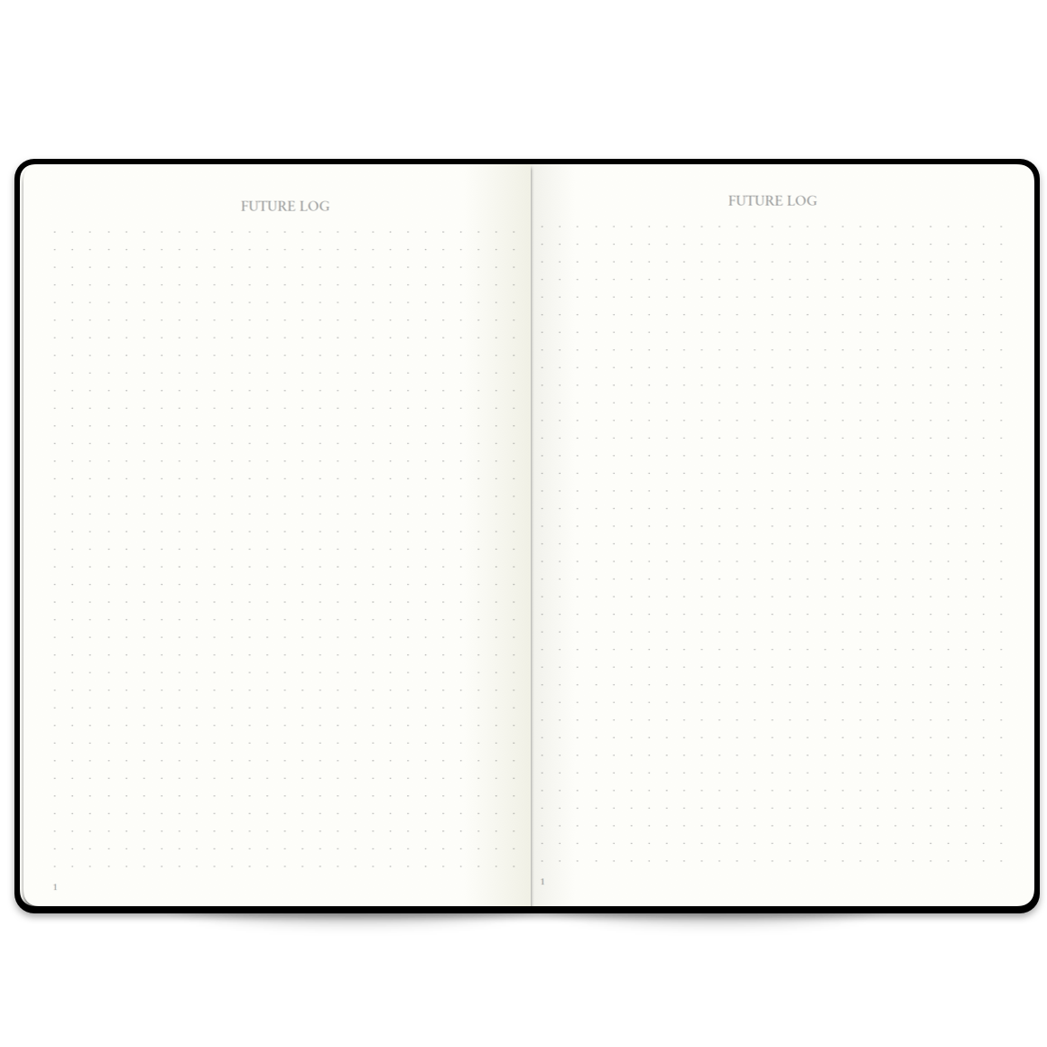 The 4-page Future Log will help you create a glimpse of the future you're working towards. The dot-grid provides a flexible canvas for you to design your future.